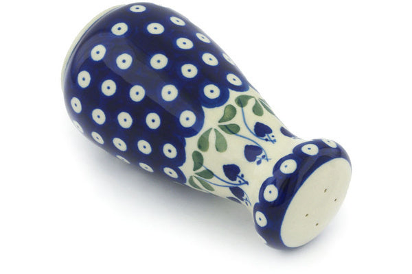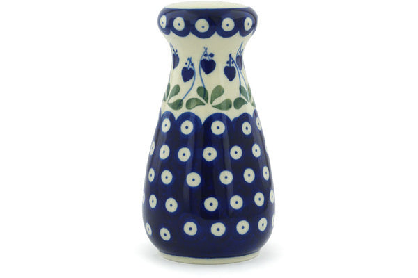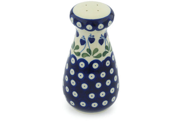 This Bleeding Heart Peacock 6" Salt Shaker was handmade and hand decorated in Boleslawiec, Poland by skilled artisans according to old traditional methods. This Polish stoneware is microwave, dishwasher, freezer, and oven safe up to 480°F. It does not contain lead or cadmium. It is part of the Bleeding Heart Peacock Collection.