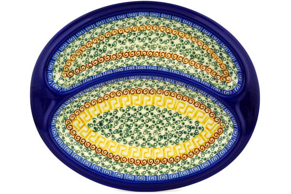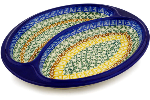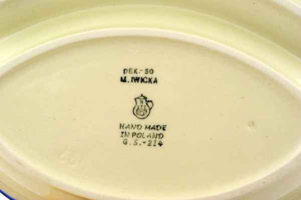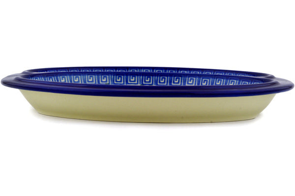 This Grecian Sea 10" sausage plate was handmade and hand decorated in Boleslawiec, Poland by skilled artisans according to old traditional methods. This Polish stoneware is microwave, dishwasher, freezer, and oven safe up to 480°F. It does not contain lead or cadmium. It is part of the Grecian Sea Collection.