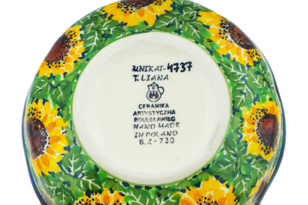 This Sunflower Bliss 6" Scalloped Bowl was handmade and hand decorated in Boleslawiec, Poland by skilled artisans according to old traditional methods. This is a Polish pottery Signature Unikat, which means that it has been hand painted with both sponges and brushes and it is signed by the artist who painted it. Unikat pieces are the most intricate works of art. Larger Unikat items take hours of very careful work to finish. This Polish stoneware is microwave, dishwasher, freezer, and oven safe up to 480°F. It does not contain lead or cadmium. It is part of the Sunflower Bliss Collection.