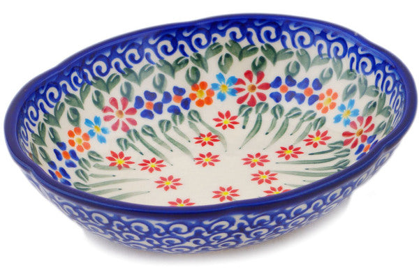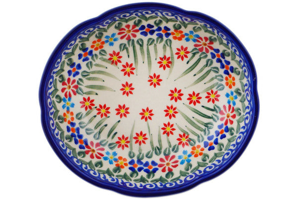 This Blissful Daisy 7" Scalloped Bowl was handmade and hand decorated in Boleslawiec, Poland by skilled artisans according to old traditional methods. This Polish stoneware is microwave, dishwasher, freezer, and oven safe up to 480°F. It does not contain lead or cadmium. It is part of the Blissful Daisy Collection.