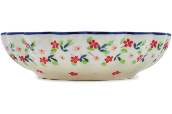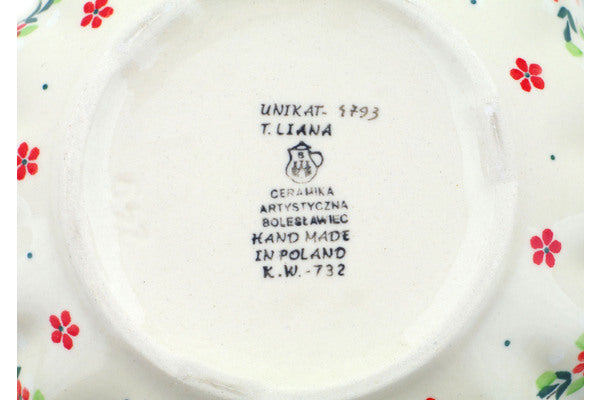 This Festive Mistletoe 7" Scalloped Bowl was handmade and hand decorated in Boleslawiec, Poland by skilled artisans according to old traditional methods. This is a Polish pottery Signature Unikat, which means that it has been hand painted with both sponges and brushes and it is signed by the artist who painted it. Unikat pieces are the most intricate works of art. Larger Unikat items take hours of very careful work to finish. This Polish stoneware is microwave, dishwasher, freezer, and oven safe up to 480°F. It does not contain lead or cadmium. It is part of the Festive Mistletoe Collection.