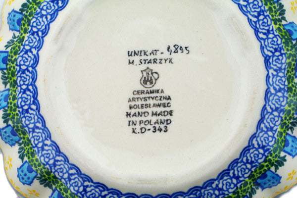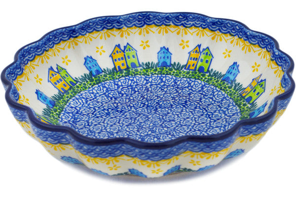 This Riverside Village 7" Scalloped Bowl was handmade and hand decorated in Boleslawiec, Poland by skilled artisans according to old traditional methods. This is a Polish pottery Signature Unikat, which means that it has been hand painted with both sponges and brushes and it is signed by the artist who painted it. Unikat pieces are the most intricate works of art. Larger Unikat items take hours of very careful work to finish. This Polish stoneware is microwave, dishwasher, freezer, and oven safe up to 480°F. It does not contain lead or cadmium. It is part of the Riverside Village Collection.