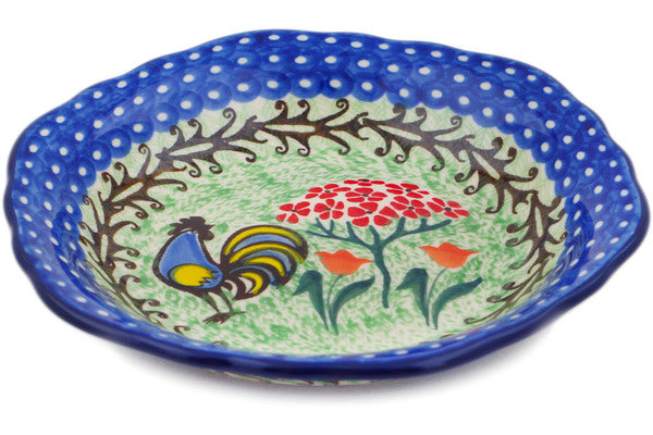This Rooster Dance 7" Scalloped Bowl was handmade and hand decorated in Boleslawiec, Poland by skilled artisans according to old traditional methods. This is a Polish pottery Signature Unikat, which means that it has been hand painted with both sponges and brushes and it is signed by the artist who painted it. Unikat pieces are the most intricate works of art. Larger Unikat items take hours of very careful work to finish. This Polish stoneware is microwave, dishwasher, freezer, and oven safe up to 480°F. It does not contain lead or cadmium. It is part of the Rooster Dance Collection.