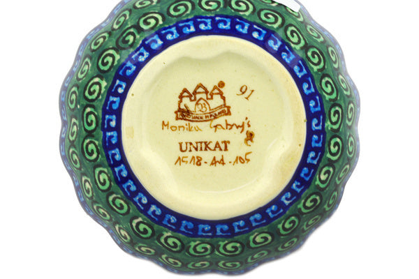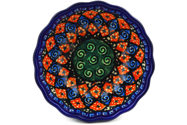 This Harlequin Small Scalloped Bowl was handmade and hand decorated in Boleslawiec, Poland by skilled artisans according to old traditional methods. This is a Polish pottery Signature Unikat, which means that it has been hand painted with both sponges and brushes and it is signed by the artist who painted it. Unikat pieces are the most intricate works of art. Larger Unikat items take hours of very careful work to finish. This Polish stoneware is microwave, dishwasher, freezer, and oven safe up to 480°F. It does not contain lead or cadmium. It is part of the Harlequin Collection.