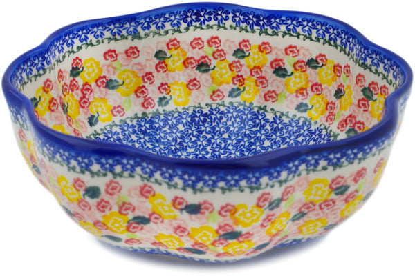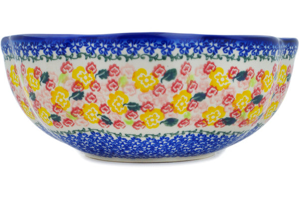 This Starburst Blooms 10" Scalloped Fluted Bowl was handmade and hand decorated in Boleslawiec, Poland by skilled artisans according to old traditional methods. This Polish stoneware is microwave, dishwasher, freezer, and oven safe up to 480°F. It does not contain lead or cadmium. It is part of the Starburst Blooms Collection.