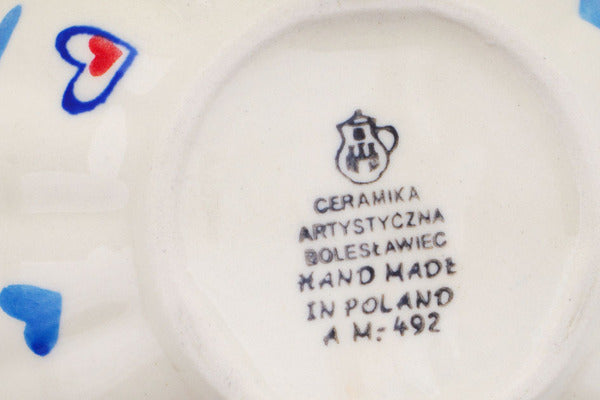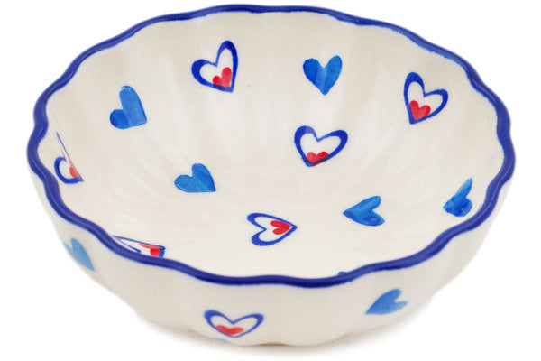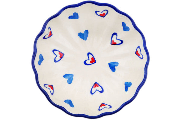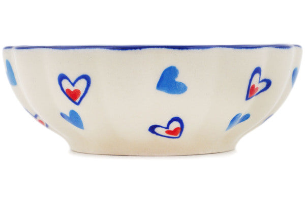 This Dancing Hearts 5" Scalloped Fluted Bowl was handmade and hand decorated in Boleslawiec, Poland by skilled artisans according to old traditional methods. This Polish stoneware is microwave, dishwasher, freezer, and oven safe up to 480°F. It does not contain lead or cadmium. It is part of the Dancing Hearts Collection.