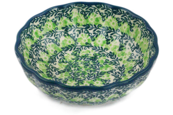 This Lush Meadow 5" Scalloped Fluted Bowl was handmade and hand decorated in Boleslawiec, Poland by skilled artisans according to old traditional methods. This Polish stoneware is microwave, dishwasher, freezer, and oven safe up to 480°F. It does not contain lead or cadmium. It is part of the Lush Meadow Collection.