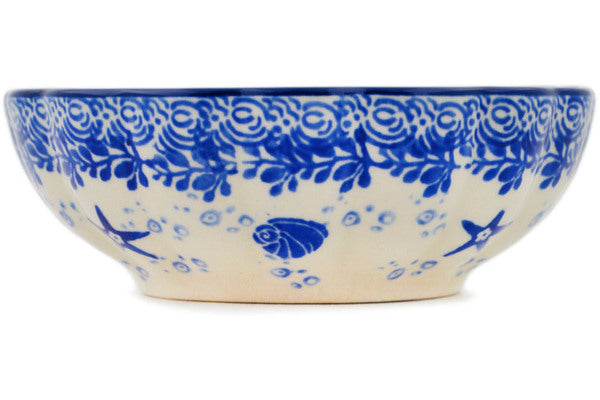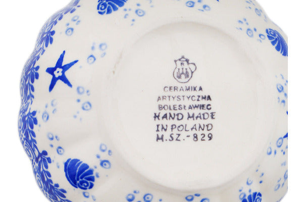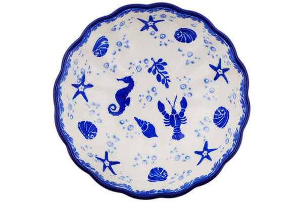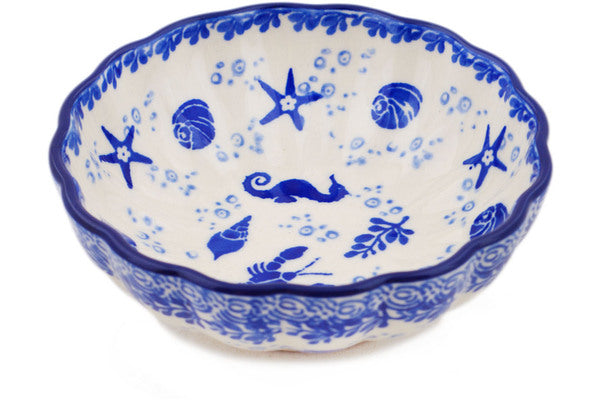 This Marine Life 5" Scalloped Fluted Bowl was handmade and hand decorated in Boleslawiec, Poland by skilled artisans according to old traditional methods. This Polish stoneware is microwave, dishwasher, freezer, and oven safe up to 480°F. It does not contain lead or cadmium. It is part of the Marine Life Collection.