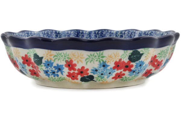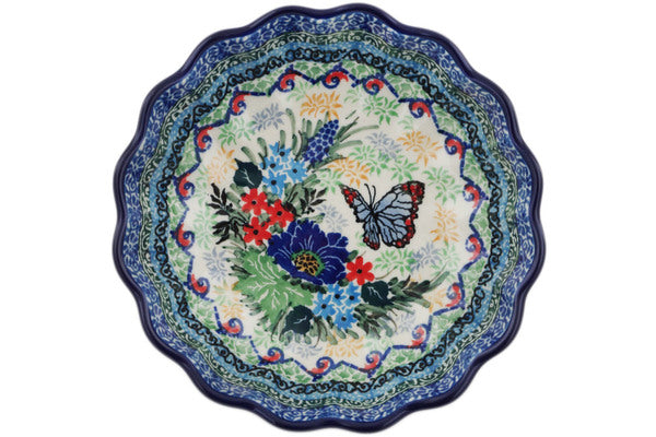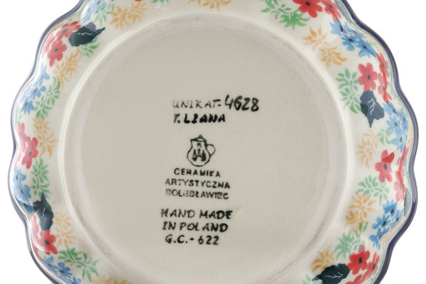 This Blue Monarch Meadow 6" Scalloped Fluted Bowl was handmade and hand decorated in Boleslawiec, Poland by skilled artisans according to old traditional methods. This is a Polish pottery Signature Unikat, which means that it has been hand painted with both sponges and brushes and it is signed by the artist who painted it. Unikat pieces are the most intricate works of art. Larger Unikat items take hours of very careful work to finish. This Polish stoneware is microwave, dishwasher, freezer, and oven safe up to 480°F. It does not contain lead or cadmium. It is part of the Blue Monarch Meadow Collection.