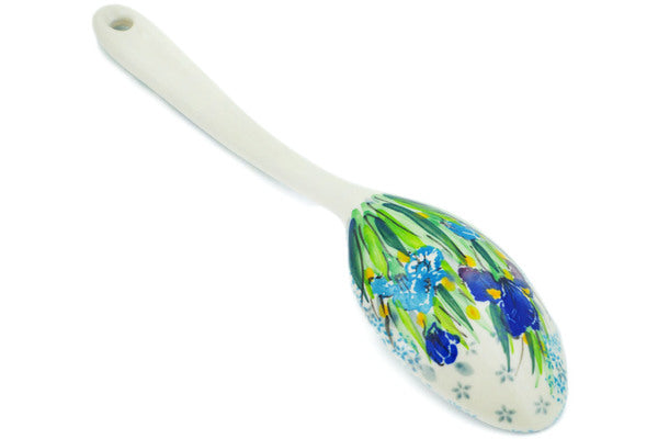This Iris Field 13" Serving Spoon was handmade and hand decorated in Boleslawiec, Poland by skilled artisans according to old traditional methods. This is a Polish pottery Signature Unikat, which means that it has been hand painted with both sponges and brushes and it is signed by the artist who painted it. Unikat pieces are the most intricate works of art. Larger Unikat items take hours of very careful work to finish. This Polish stoneware is microwave, dishwasher, freezer, and oven safe up to 480°F. It does not contain lead or cadmium. It is part of the Iris Field Collection.