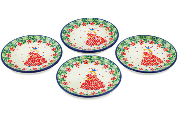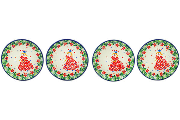 This Princess In A Red Dress Set of 4 Coasters was handmade and hand decorated in Boleslawiec, Poland by skilled artisans according to old traditional methods. This Polish stoneware is microwave, dishwasher, freezer, and oven safe up to 480°F. It does not contain lead or cadmium. It is part of the Princess In A Red Dress Collection.