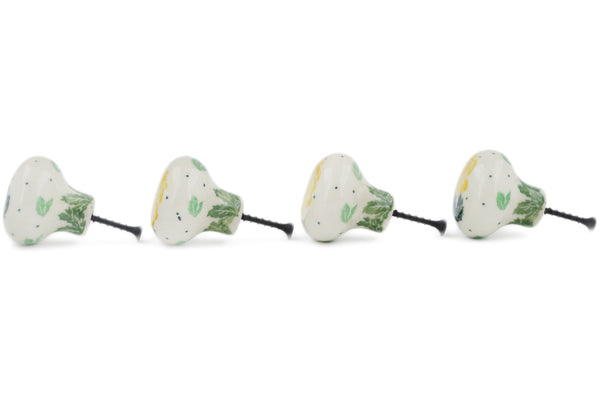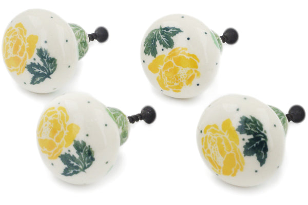 This Yellow Rose Set of 4 Drawer Pull Knobs 1-1/2 inch was handmade and hand decorated in Boleslawiec, Poland by skilled artisans according to old traditional methods. This Polish stoneware is microwave, dishwasher, freezer, and oven safe up to 480°F. It does not contain lead or cadmium. It is part of the Yellow Rose Collection.