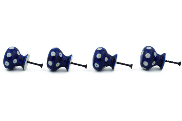 This Blue Eyes Set of 4 Drawer Pull Knobs was handmade and hand decorated in Boleslawiec, Poland by skilled artisans according to old traditional methods. This Polish stoneware is microwave, dishwasher, freezer, and oven safe up to 480°F. It does not contain lead or cadmium. It is part of the Blue Eyes Collection.