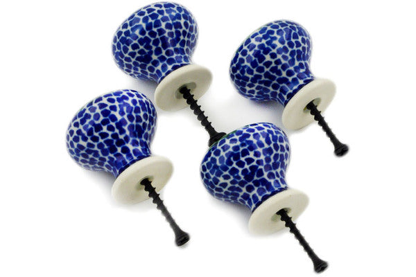 This Polka Dot Daisy Set of 4 Drawer Pull Knobs was handmade and hand decorated in Boleslawiec, Poland by skilled artisans according to old traditional methods. This Polish stoneware is microwave, dishwasher, freezer, and oven safe up to 480°F. It does not contain lead or cadmium. It is part of the Polka Dot Daisy Collection.