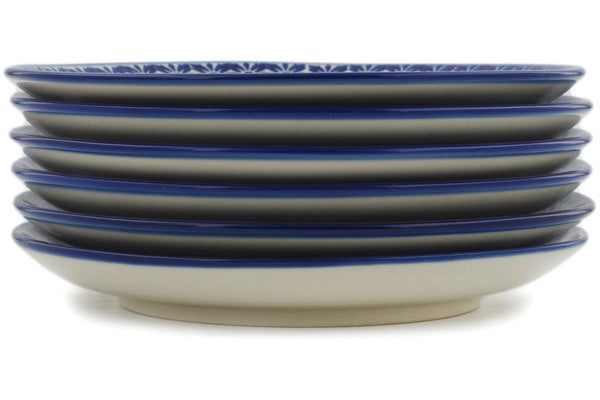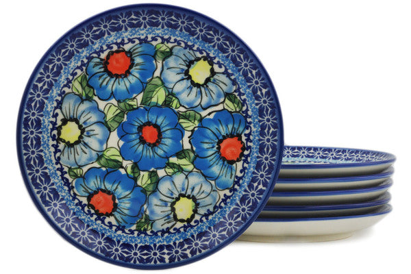 This Bold Blue Poppies Set of 6 dessert plates was handmade and hand decorated in Boleslawiec, Poland by skilled artisans according to old traditional methods. This is a Polish pottery Signature Unikat, which means that it has been hand painted with both sponges and brushes and it is signed by the artist who painted it. Unikat pieces are the most intricate works of art. Larger Unikat items take hours of very careful work to finish. This Polish stoneware is microwave, dishwasher, freezer, and oven safe up to 480°F. It does not contain lead or cadmium. It is part of the Bold Blue Poppies Collection.