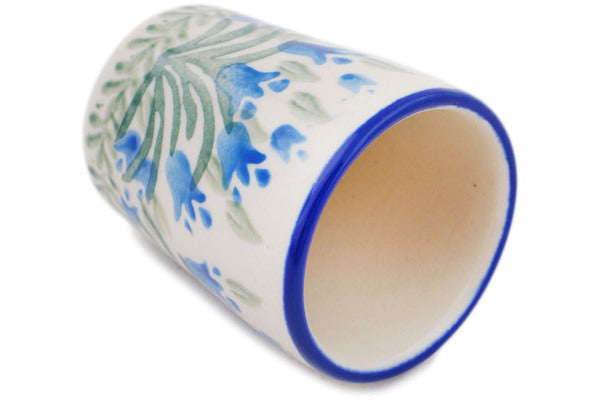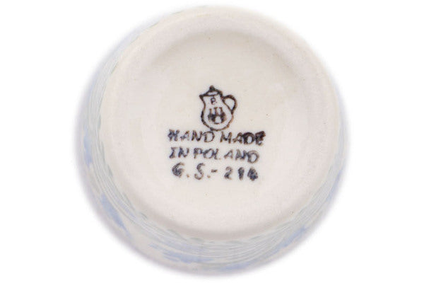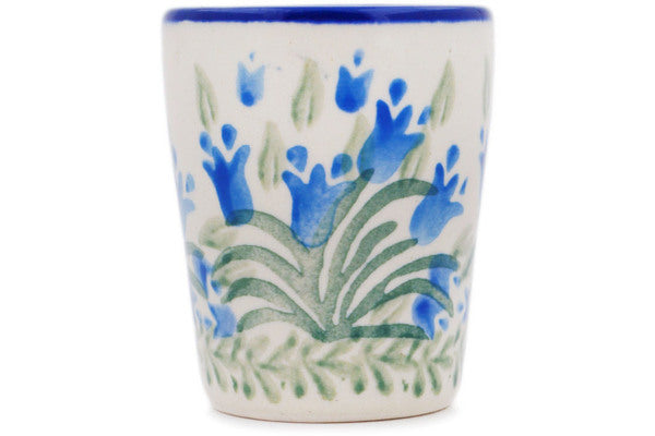 This Feathery Bluebells 2 oz shot glass was handmade and hand decorated in Boleslawiec, Poland by skilled artisans according to old traditional methods. This Polish stoneware is microwave, dishwasher, freezer, and oven safe up to 480°F. It does not contain lead or cadmium. It is part of the Feathery Bluebells Collection.