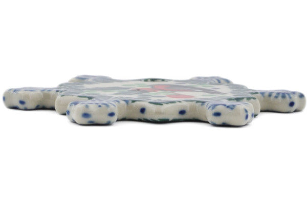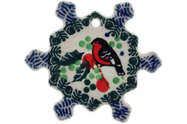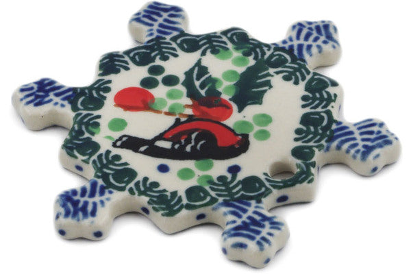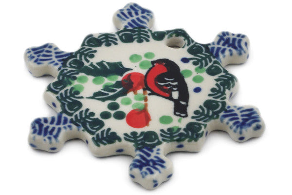 This Christmas Chickadee 3" Snowflake Pendant was handmade and hand decorated in Boleslawiec, Poland by skilled artisans according to old traditional methods. This Polish stoneware is microwave, dishwasher, freezer, and oven safe up to 480°F. It does not contain lead or cadmium. It is part of the Christmas Chickadee Collection.