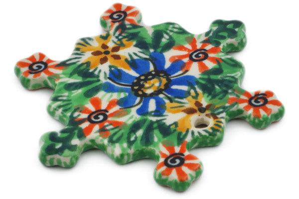 This Profusion 3" Snowflake Pendant was handmade and hand decorated in Boleslawiec, Poland by skilled artisans according to old traditional methods. This is a Polish pottery Signature Unikat, which means that it has been hand painted with both sponges and brushes and it is signed by the artist who painted it. Unikat pieces are the most intricate works of art. Larger Unikat items take hours of very careful work to finish. This Polish stoneware is microwave, dishwasher, freezer, and oven safe up to 480°F. It does not contain lead or cadmium. It is part of the Profusion Collection.