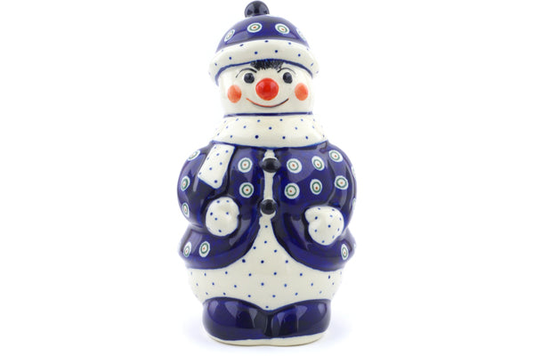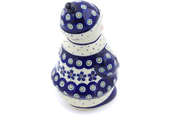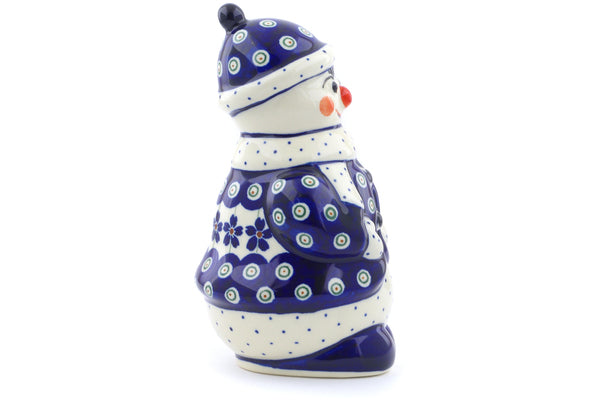 This Flowering Peacock 7" Snowman Figurine was handmade and hand decorated in Boleslawiec, Poland by skilled artisans according to old traditional methods. This Polish stoneware is microwave, dishwasher, freezer, and oven safe up to 480°F. It does not contain lead or cadmium. It is part of the Flowering Peacock Collection.