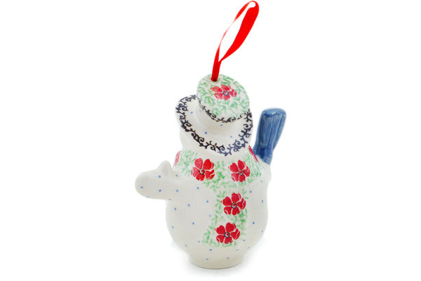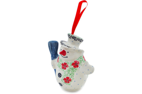 This Maraschino 4" Snowman Ornament With Bell was handmade and hand decorated in Boleslawiec, Poland by skilled artisans according to old traditional methods. This Polish stoneware is microwave, dishwasher, freezer, and oven safe up to 480°F. It does not contain lead or cadmium. It is part of the Maraschino Collection.