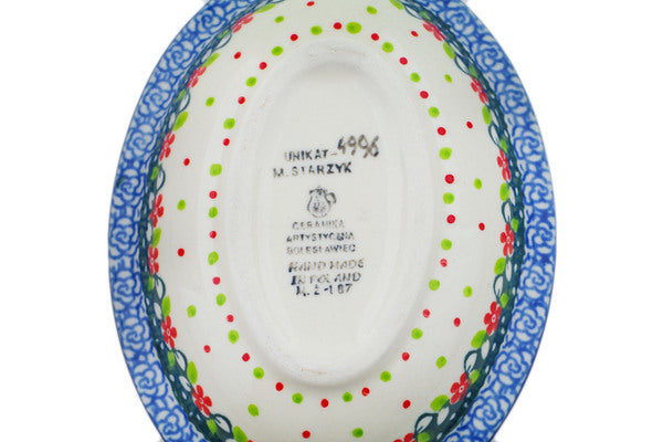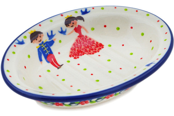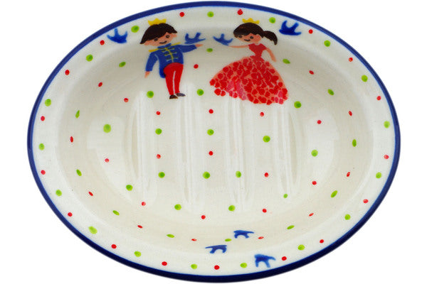 This Bird Prince And Princess 5" Soap Dish was handmade and hand decorated in Boleslawiec, Poland by skilled artisans according to old traditional methods. This is a Polish pottery Signature Unikat, which means that it has been hand painted with both sponges and brushes and it is signed by the artist who painted it. Unikat pieces are the most intricate works of art. Larger Unikat items take hours of very careful work to finish. This Polish stoneware is microwave, dishwasher, freezer, and oven safe up to 480°F. It does not contain lead or cadmium. It is part of the Bird Prince And Princess Collection.