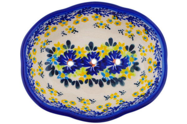 This Cornflower Meadow 5" Soap Dish was handmade and hand decorated in Boleslawiec, Poland by skilled artisans according to old traditional methods. This Polish stoneware is microwave, dishwasher, freezer, and oven safe up to 480°F. It does not contain lead or cadmium. It is part of the Cornflower Meadow Collection.