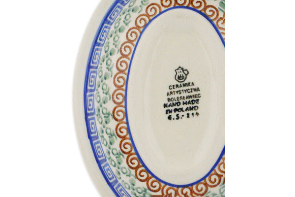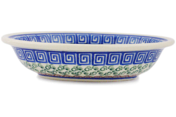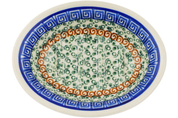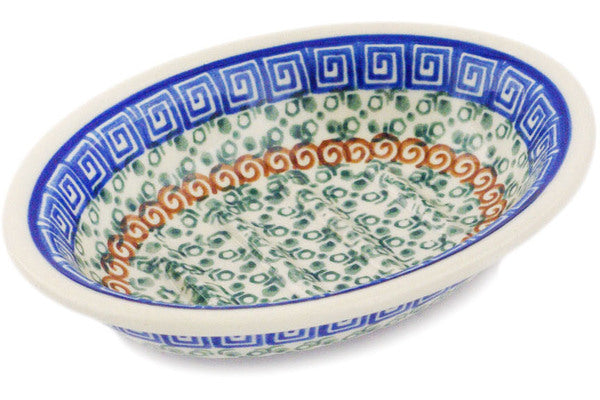 This Grecian Sea 5" Soap Dish was handmade and hand decorated in Boleslawiec, Poland by skilled artisans according to old traditional methods. This Polish stoneware is microwave, dishwasher, freezer, and oven safe up to 480°F. It does not contain lead or cadmium. It is part of the Grecian Sea Collection.