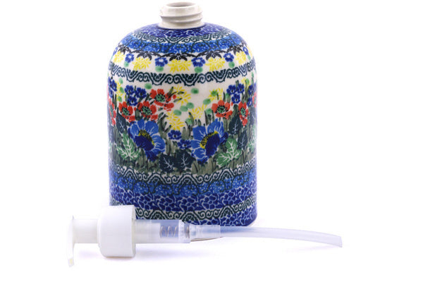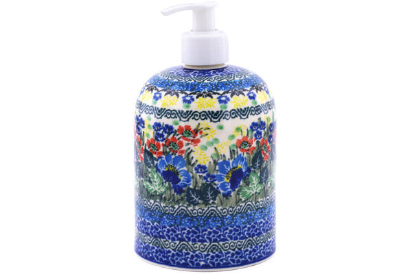 This Blue Bird Solo 7" Soap Dispenser was handmade and hand decorated in Boleslawiec, Poland by skilled artisans according to old traditional methods. This is a Polish pottery Signature Unikat, which means that it has been hand painted with both sponges and brushes and it is signed by the artist who painted it. Unikat pieces are the most intricate works of art. Larger Unikat items take hours of very careful work to finish. This Polish stoneware is microwave, dishwasher, freezer, and oven safe up to 480°F. It does not contain lead or cadmium. It is part of the Blue Bird Solo Collection.