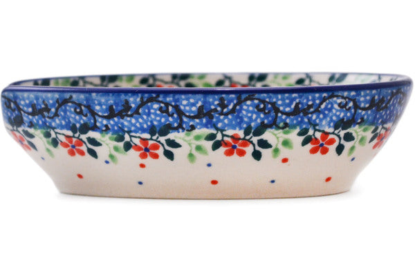 This A Flower Fairytale 5" Spoon Rest was handmade and hand decorated in Boleslawiec, Poland by skilled artisans according to old traditional methods. This is a Polish pottery Signature Unikat, which means that it has been hand painted with both sponges and brushes and it is signed by the artist who painted it. Unikat pieces are the most intricate works of art. Larger Unikat items take hours of very careful work to finish. This Polish stoneware is microwave, dishwasher, freezer, and oven safe up to 480°F. It does not contain lead or cadmium. It is part of the A Flower Fairytale Collection.