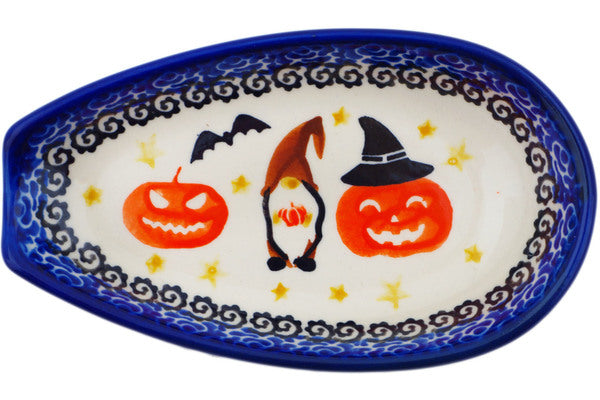 This Harvest Haunt 5" Spoon Rest was handmade and hand decorated in Boleslawiec, Poland by skilled artisans according to old traditional methods. This Polish stoneware is microwave, dishwasher, freezer, and oven safe up to 480°F. It does not contain lead or cadmium. It is part of the Harvest Haunt Collection.