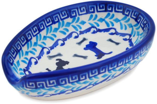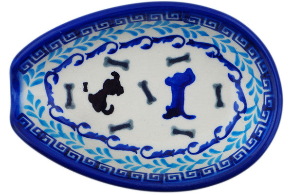 This Puppy Pleasure 5" Spoon Rest was handmade and hand decorated in Boleslawiec, Poland by skilled artisans according to old traditional methods. This Polish stoneware is microwave, dishwasher, freezer, and oven safe up to 480°F. It does not contain lead or cadmium. It is part of the Puppy Pleasure Collection.