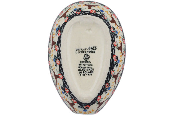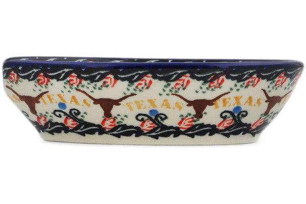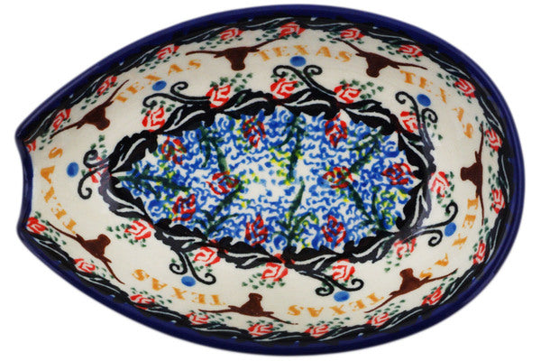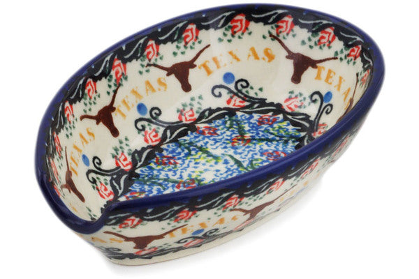 This Texas Feast 5" Spoon Rest was handmade and hand decorated in Boleslawiec, Poland by skilled artisans according to old traditional methods. This is a Polish pottery Signature Unikat, which means that it has been hand painted with both sponges and brushes and it is signed by the artist who painted it. Unikat pieces are the most intricate works of art. Larger Unikat items take hours of very careful work to finish. This Polish stoneware is microwave, dishwasher, freezer, and oven safe up to 480°F. It does not contain lead or cadmium. It is part of the Texas Feast Collection.