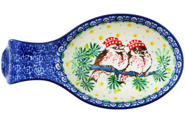 This Cozy Bullfinch 7" Spoon Rest was handmade and hand decorated in Boleslawiec, Poland by skilled artisans according to old traditional methods. This is a Polish pottery Signature Unikat, which means that it has been hand painted with both sponges and brushes and it is signed by the artist who painted it. Unikat pieces are the most intricate works of art. Larger Unikat items take hours of very careful work to finish. This Polish stoneware is microwave, dishwasher, freezer, and oven safe up to 480°F. It does not contain lead or cadmium. It is part of the Cozy Bullfinch Collection.