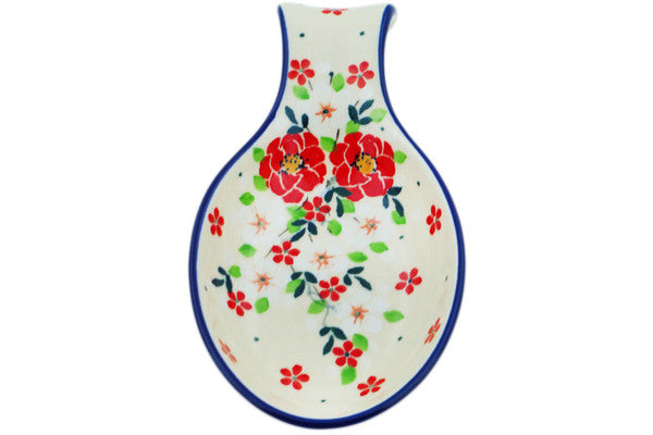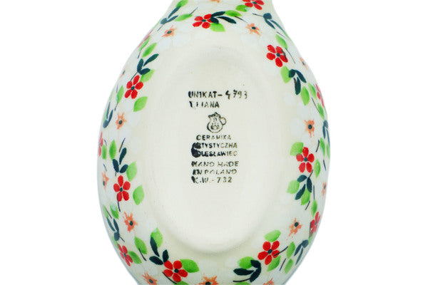 This Festive Mistletoe 7" Spoon Rest was handmade and hand decorated in Boleslawiec, Poland by skilled artisans according to old traditional methods. This is a Polish pottery Signature Unikat, which means that it has been hand painted with both sponges and brushes and it is signed by the artist who painted it. Unikat pieces are the most intricate works of art. Larger Unikat items take hours of very careful work to finish. This Polish stoneware is microwave, dishwasher, freezer, and oven safe up to 480°F. It does not contain lead or cadmium. It is part of the Festive Mistletoe Collection.