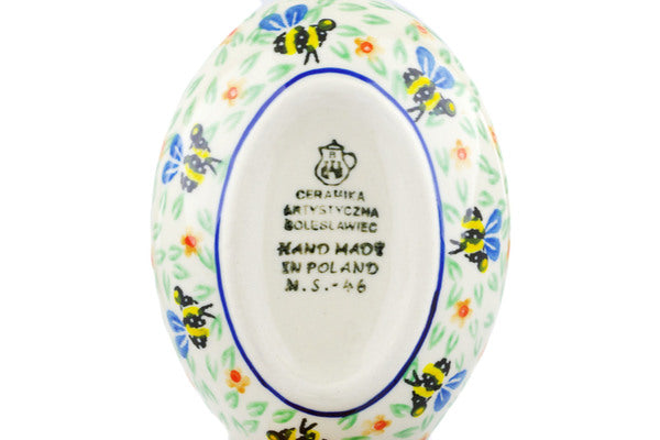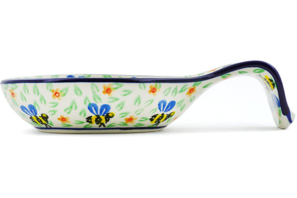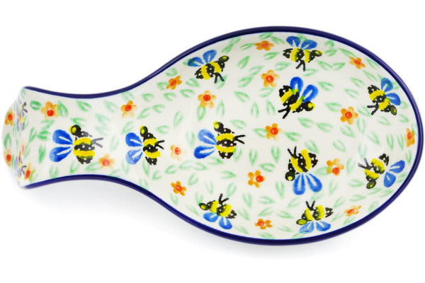 This Honey Bee 7" Spoon Rest was handmade and hand decorated in Boleslawiec, Poland by skilled artisans according to old traditional methods. This Polish stoneware is microwave, dishwasher, freezer, and oven safe up to 480°F. It does not contain lead or cadmium. It is part of the Honey Bee Collection.