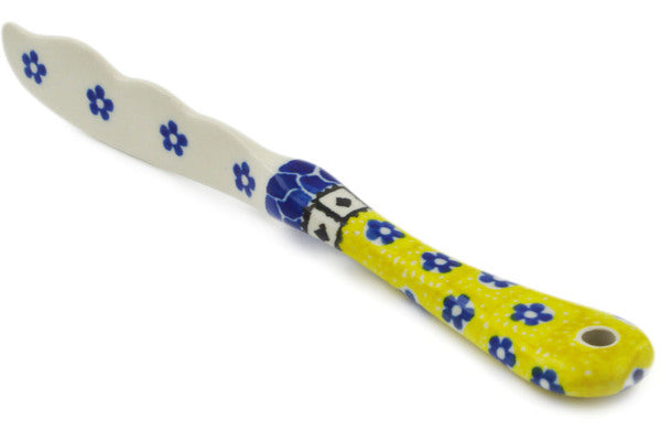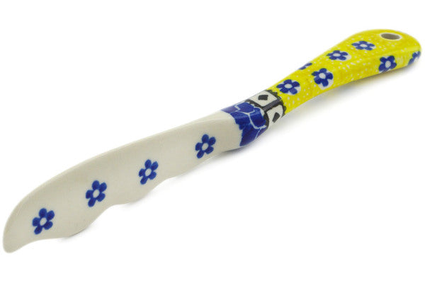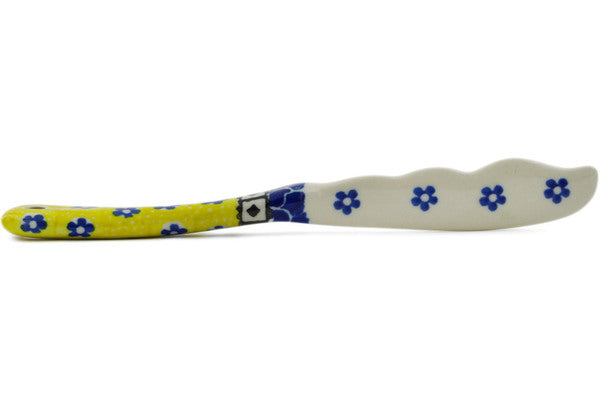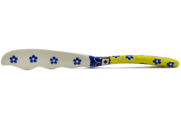 This Sunburst Daisies 7" Spreading Knife was handmade and hand decorated in Boleslawiec, Poland by skilled artisans according to old traditional methods. This Polish stoneware is microwave, dishwasher, freezer, and oven safe up to 480°F. It does not contain lead or cadmium. It is part of the Sunburst Daisies Collection.