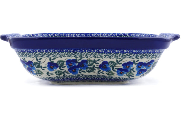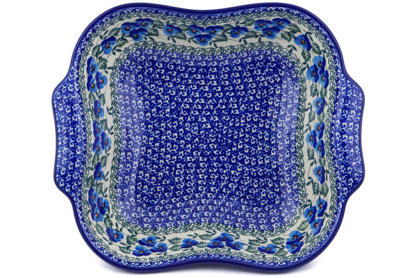 This Blue Pansy 11" Square Baker with Handles was handmade and hand decorated in Boleslawiec, Poland by skilled artisans according to old traditional methods. This Polish stoneware is microwave, dishwasher, freezer, and oven safe up to 480°F. It does not contain lead or cadmium. It is part of the Blue Pansy Collection.