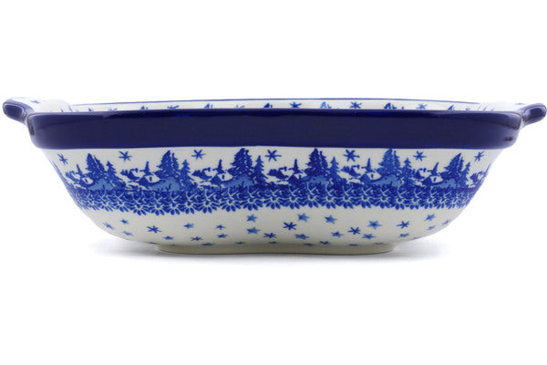 This Blue Winter 11" Square Baker with Handles was handmade and hand decorated in Boleslawiec, Poland by skilled artisans according to old traditional methods. This Polish stoneware is microwave, dishwasher, freezer, and oven safe up to 480°F. It does not contain lead or cadmium. It is part of the Blue Winter Collection.