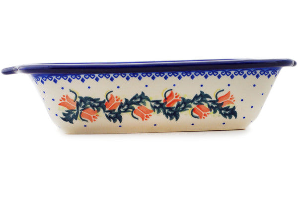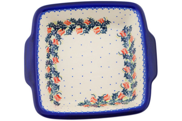 This California Poppies 12" Square Baker with Handles was handmade and hand decorated in Boleslawiec, Poland by skilled artisans according to old traditional methods. This Polish stoneware is microwave, dishwasher, freezer, and oven safe up to 480°F. It does not contain lead or cadmium. It is part of the California Poppies Collection.