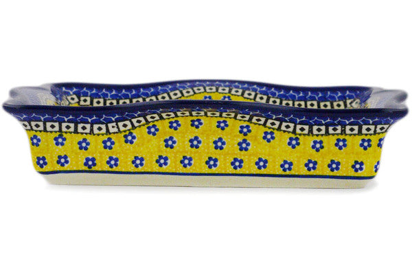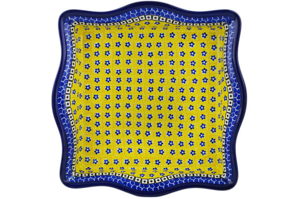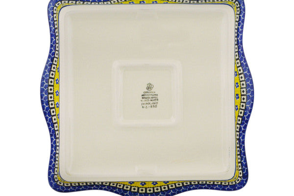 This Sunburst Daisies 12" Square Bowl was handmade and hand decorated in Boleslawiec, Poland by skilled artisans according to old traditional methods. This Polish stoneware is microwave, dishwasher, freezer, and oven safe up to 480°F. It does not contain lead or cadmium. It is part of the Sunburst Daisies Collection.