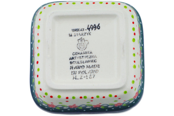 This Bird Prince And Princess 4" Square Bowl was handmade and hand decorated in Boleslawiec, Poland by skilled artisans according to old traditional methods. This is a Polish pottery Signature Unikat, which means that it has been hand painted with both sponges and brushes and it is signed by the artist who painted it. Unikat pieces are the most intricate works of art. Larger Unikat items take hours of very careful work to finish. This Polish stoneware is microwave, dishwasher, freezer, and oven safe up to 480°F. It does not contain lead or cadmium. It is part of the Bird Prince And Princess Collection.
