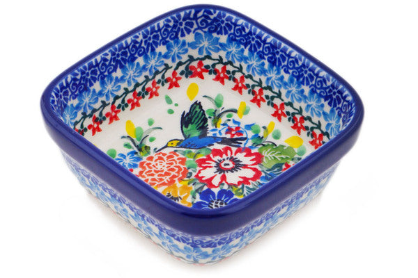 This Hummingbird Meadow 4" Square Bowl was handmade and hand decorated in Boleslawiec, Poland by skilled artisans according to old traditional methods. This is a Polish pottery Signature Unikat, which means that it has been hand painted with both sponges and brushes and it is signed by the artist who painted it. Unikat pieces are the most intricate works of art. Larger Unikat items take hours of very careful work to finish. This Polish stoneware is microwave, dishwasher, freezer, and oven safe up to 480°F. It does not contain lead or cadmium. It is part of the Hummingbird Meadow Collection.