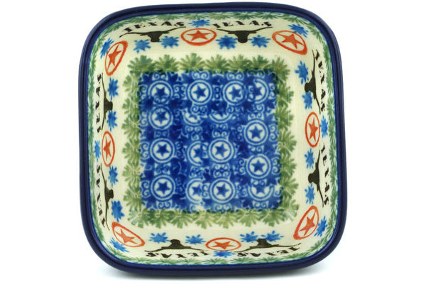 This State Of Texas 4" Square Bowl was handmade and hand decorated in Boleslawiec, Poland by skilled artisans according to old traditional methods. This Polish stoneware is microwave, dishwasher, freezer, and oven safe up to 480°F. It does not contain lead or cadmium. It is part of the State Of Texas Collection.