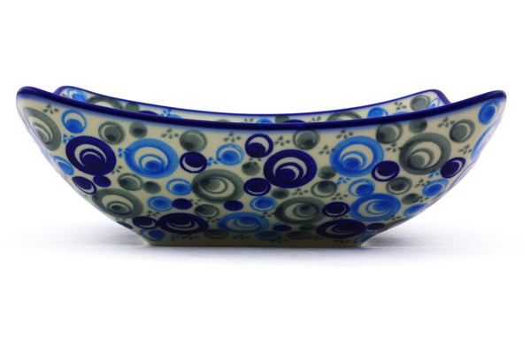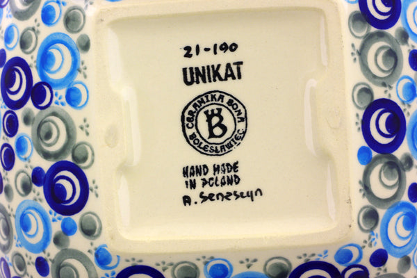 This Blue Peacock Eye 8" Square Bowl was handmade and hand decorated in Boleslawiec, Poland by skilled artisans according to old traditional methods. This Polish stoneware is microwave, dishwasher, freezer, and oven safe up to 480°F. It does not contain lead or cadmium. It is part of the Blue Peacock Eye Collection.