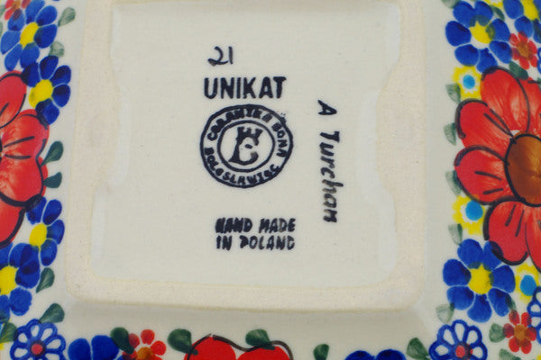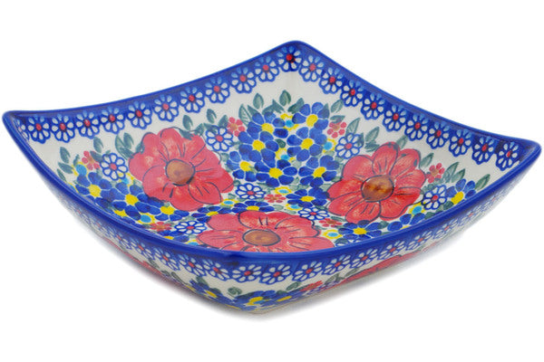 This Bold Sights 8" Square Bowl was handmade and hand decorated in Boleslawiec, Poland by skilled artisans according to old traditional methods. This is a Polish pottery Signature Unikat, which means that it has been hand painted with both sponges and brushes and it is signed by the artist who painted it. Unikat pieces are the most intricate works of art. Larger Unikat items take hours of very careful work to finish. This Polish stoneware is microwave, dishwasher, freezer, and oven safe up to 480°F. It does not contain lead or cadmium. It is part of the Bold Sights Collection.