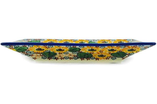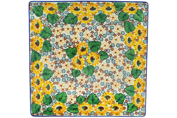 This Country Sunflower 10" Square Plate was handmade and hand decorated in Boleslawiec, Poland by skilled artisans according to old traditional methods. This is a Polish pottery Signature Unikat, which means that it has been hand painted with both sponges and brushes and it is signed by the artist who painted it. Unikat pieces are the most intricate works of art. Larger Unikat items take hours of very careful work to finish. This Polish stoneware is microwave, dishwasher, freezer, and oven safe up to 480°F. It does not contain lead or cadmium. It is part of the Country Sunflower Collection.