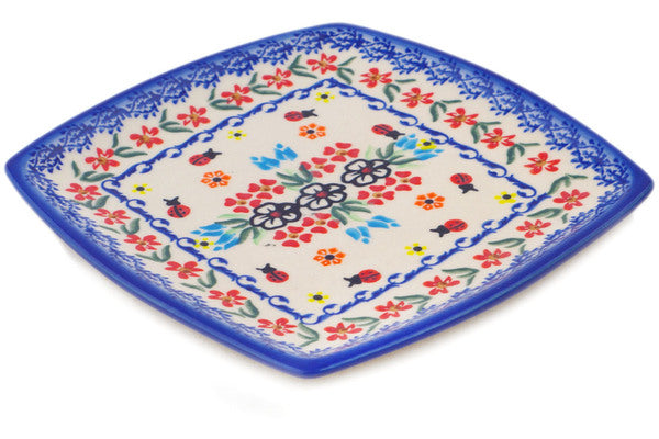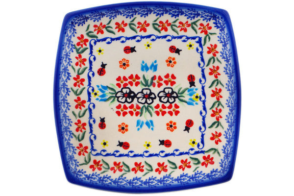 This Fanciful Ladybug 7" Square Plate was handmade and hand decorated in Boleslawiec, Poland by skilled artisans according to old traditional methods. This Polish stoneware is microwave, dishwasher, freezer, and oven safe up to 480°F. It does not contain lead or cadmium. It is part of the Fanciful Ladybug Collection.