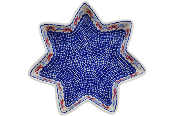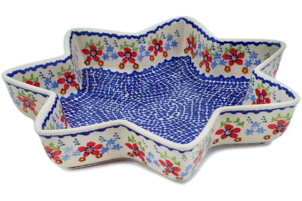 This Red Flower Meadow 12" Star Shaped Bowl was handmade and hand decorated in Boleslawiec, Poland by skilled artisans according to old traditional methods. This Polish stoneware is microwave, dishwasher, freezer, and oven safe up to 480°F. It does not contain lead or cadmium. It is part of the Red Flower Meadow Collection.