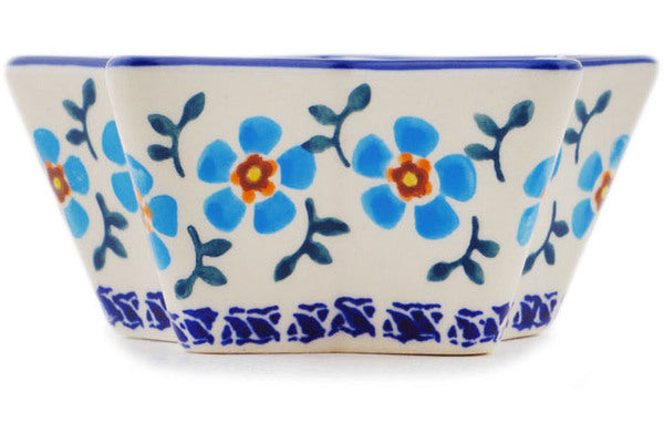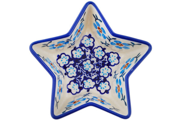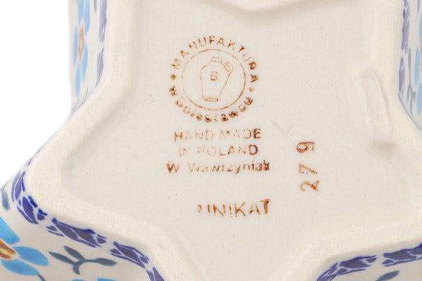 This Blue Chain 5" Star Shaped Bowl was handmade and hand decorated in Boleslawiec, Poland by skilled artisans according to old traditional methods. This is a Polish pottery Signature Unikat, which means that it has been hand painted with both sponges and brushes and it is signed by the artist who painted it. Unikat pieces are the most intricate works of art. Larger Unikat items take hours of very careful work to finish. This Polish stoneware is microwave, dishwasher, freezer, and oven safe up to 480°F. It does not contain lead or cadmium. It is part of the Blue Chain Collection.