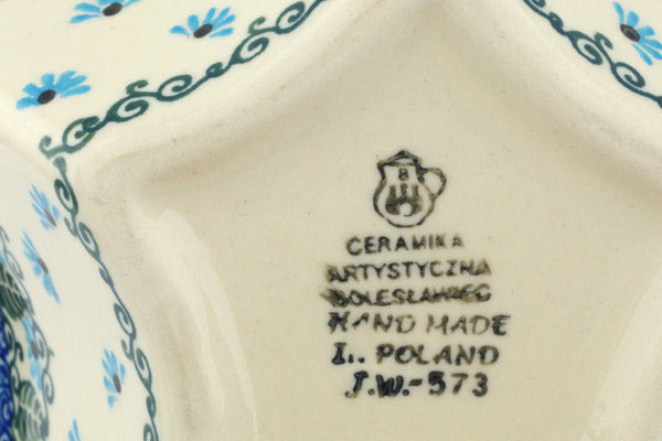 This Forget Me Not 8" Star Shaped Bowl was handmade and hand decorated in Boleslawiec, Poland by skilled artisans according to old traditional methods. This is a Polish pottery Signature Unikat, which means that it has been hand painted with both sponges and brushes and it is signed by the artist who painted it. Unikat pieces are the most intricate works of art. Larger Unikat items take hours of very careful work to finish. This Polish stoneware is microwave, dishwasher, freezer, and oven safe up to 480°F. It does not contain lead or cadmium. It is part of the Forget Me Not Collection.
